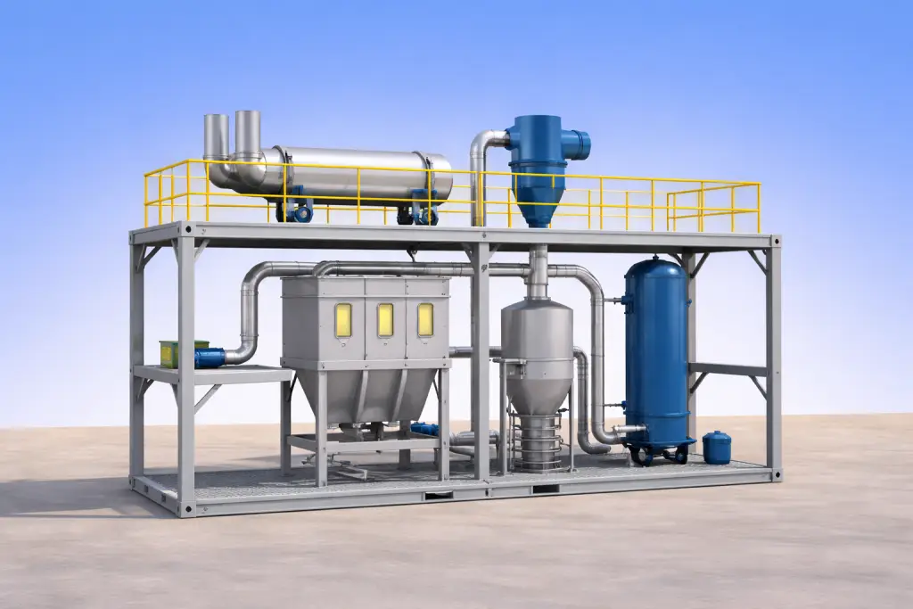 The 11,800 mm double-stacked module is dedicated to environmental control. The bottom container houses the lower sections and auxiliary parts of the dust collector, air cyclone, and gas scrubber, while the top container contains the main bodies of these systems. The two containers are designed to align and connect precisely, forming one integrated air pollution control unit.